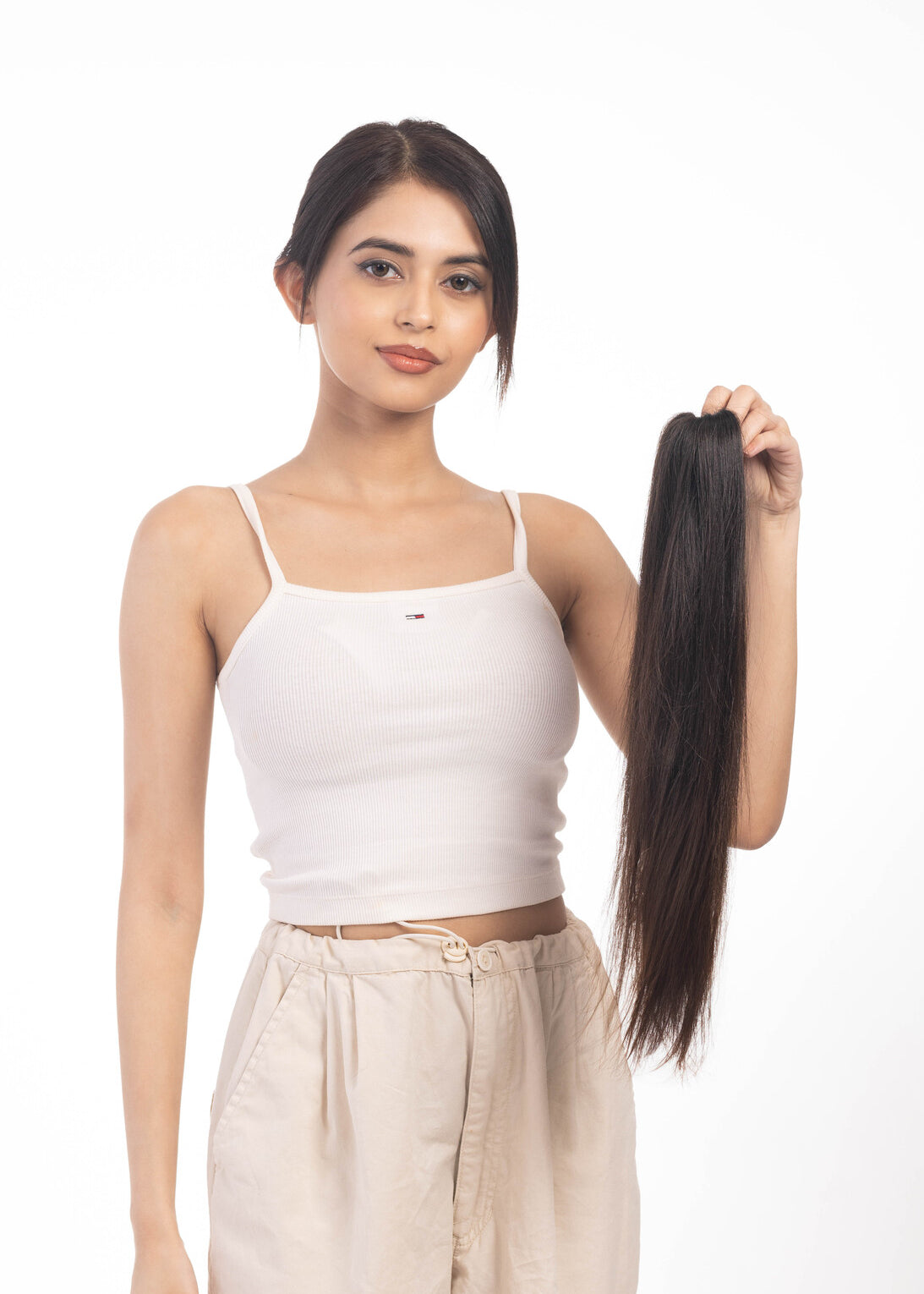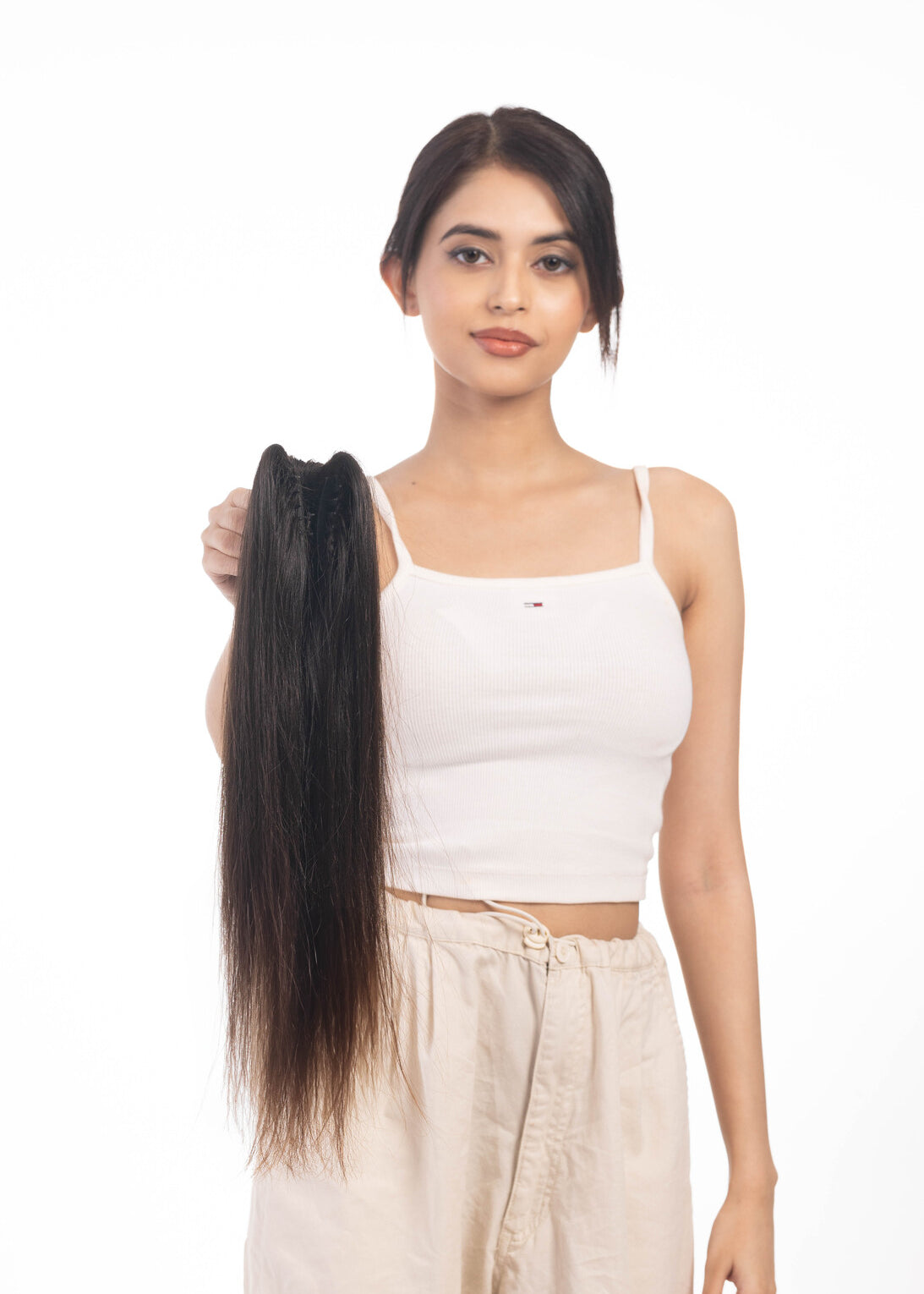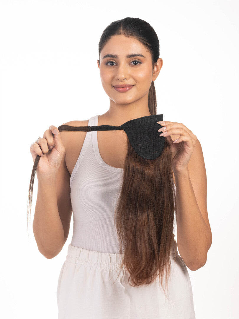 Ponytail hair extensions are women’s hair accessories made with 100% human hair. They add an instant length and volume to women’s ponytails. There are short and long pony extensions available for women at HairJoy. The clip in ponytail is available in a clutch and wrap-around application mechanism, which provides rigid support to the ponytail. It gives a full-bodied volume and polished appearance.
