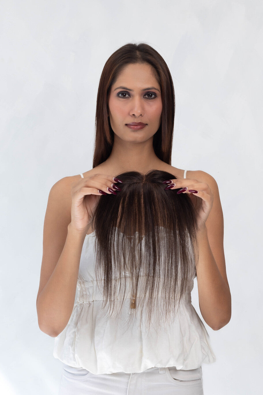 This Hair topper has a lace base with hair strands woven into small holes. Hair toppers in a lace base are comparatively less expensive than silk base. They are extremely soft, giving you comfort all day. You can bleach the knots of the hair to give it a more natural look.