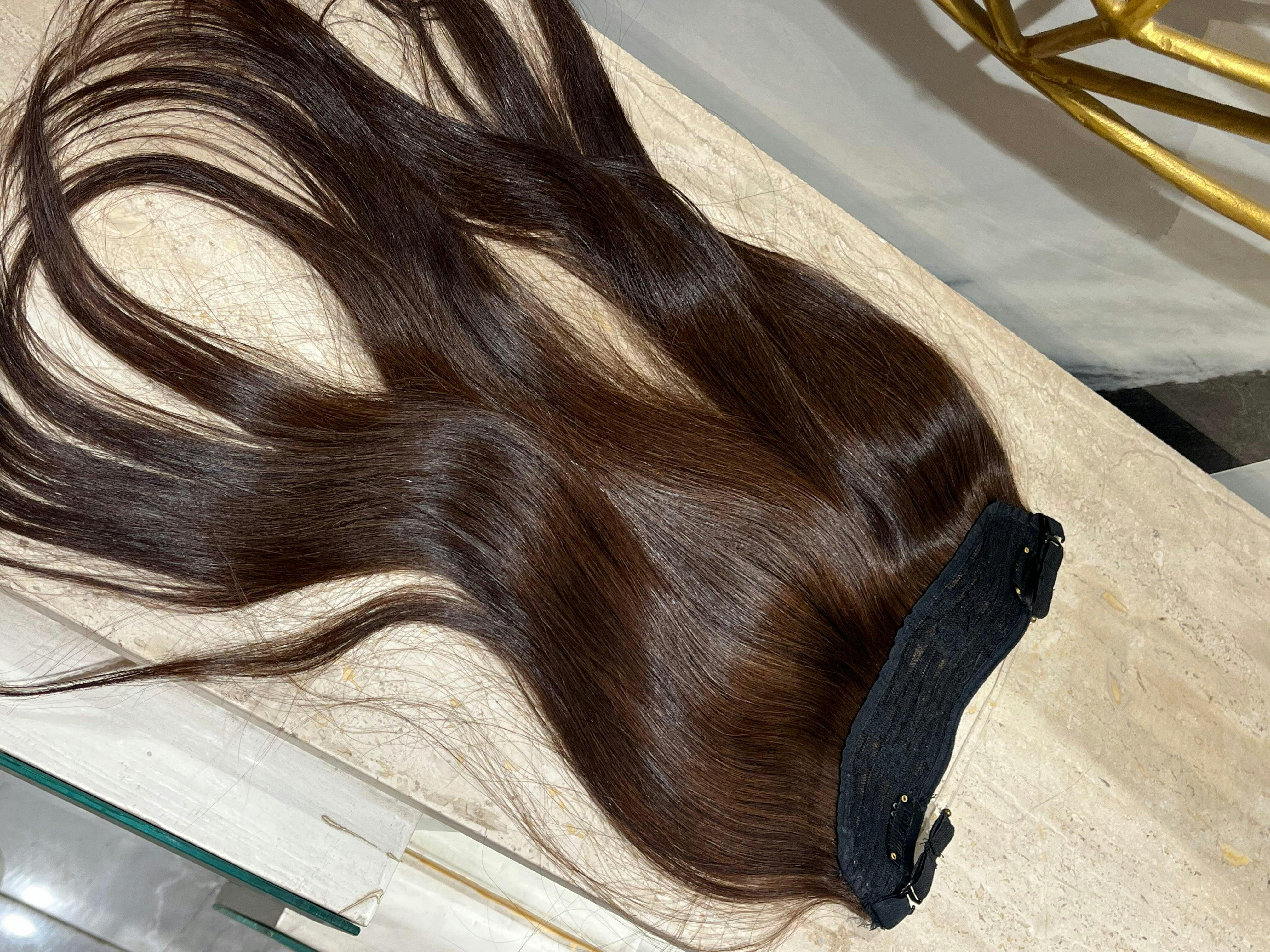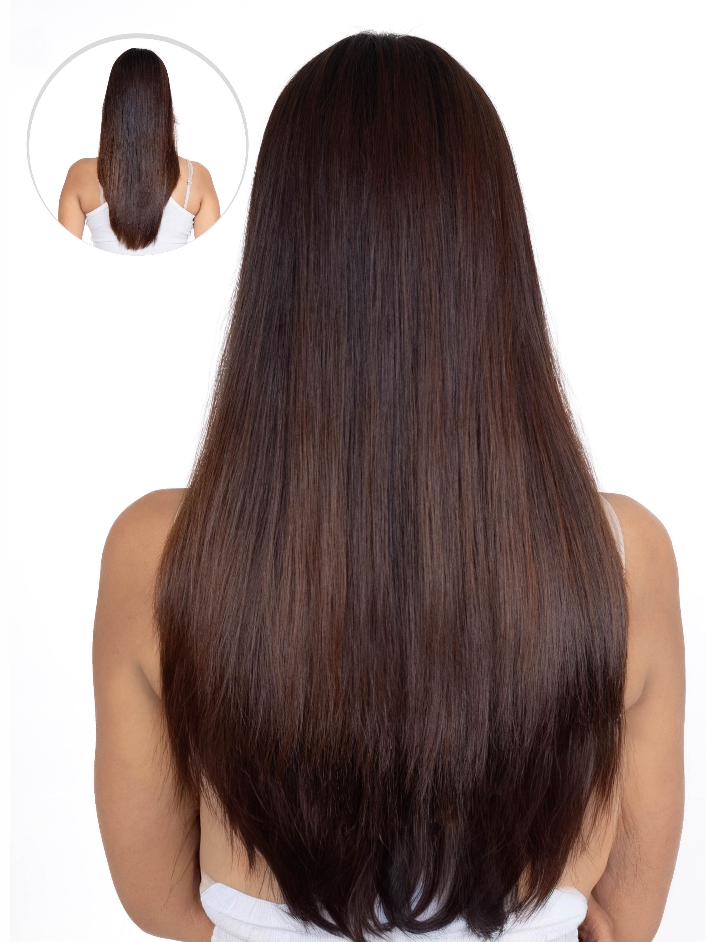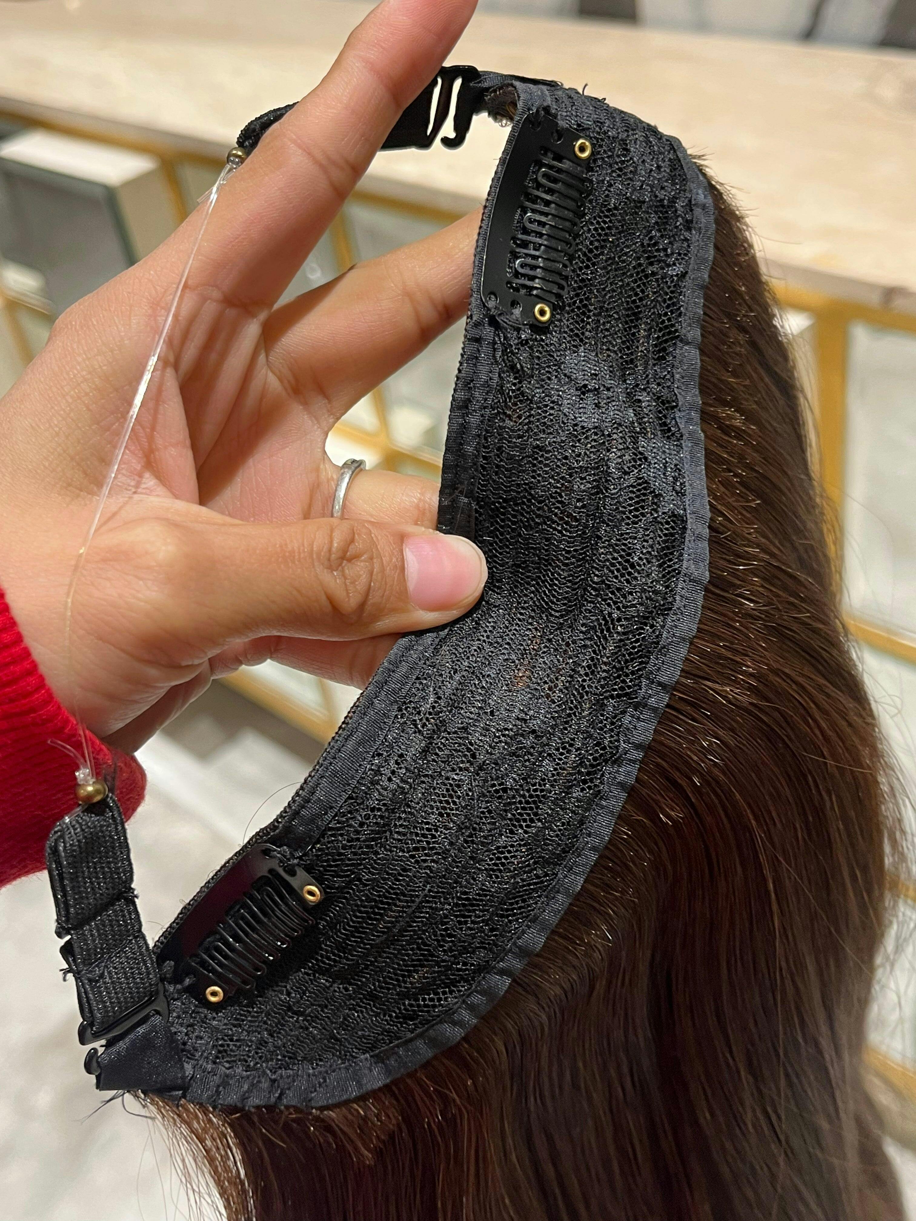 The Halo Extension delivers instant length and volume using an invisible adjustable band—no clips, no glue, no effort. It sits comfortably around your crown and blends flawlessly with your natural hair.