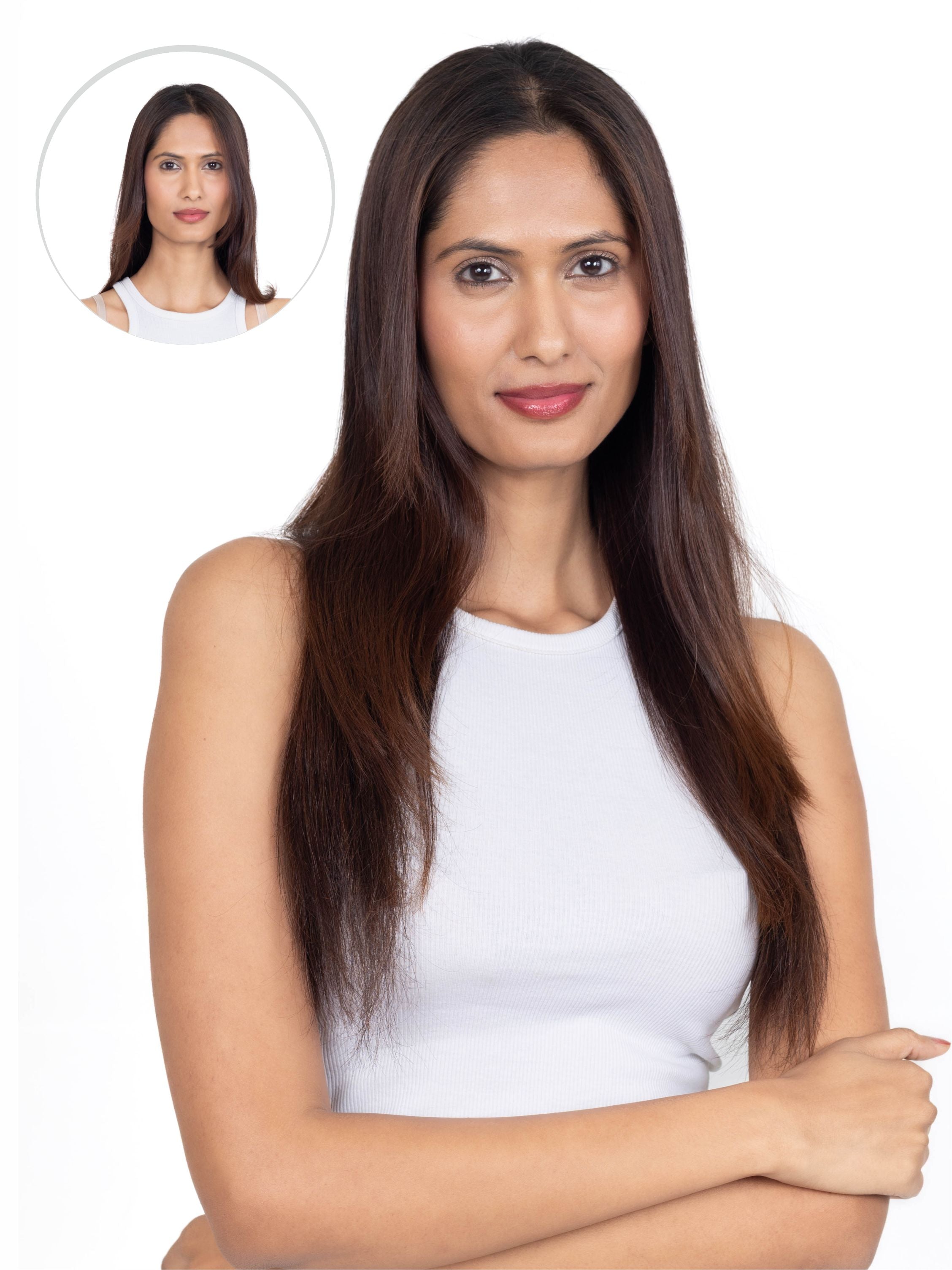Made using premium South Indian hair, it holds styling beautifully while retaining shine and healthy movement. Lightweight yet dense, the halo provides natural volume from root to tip.